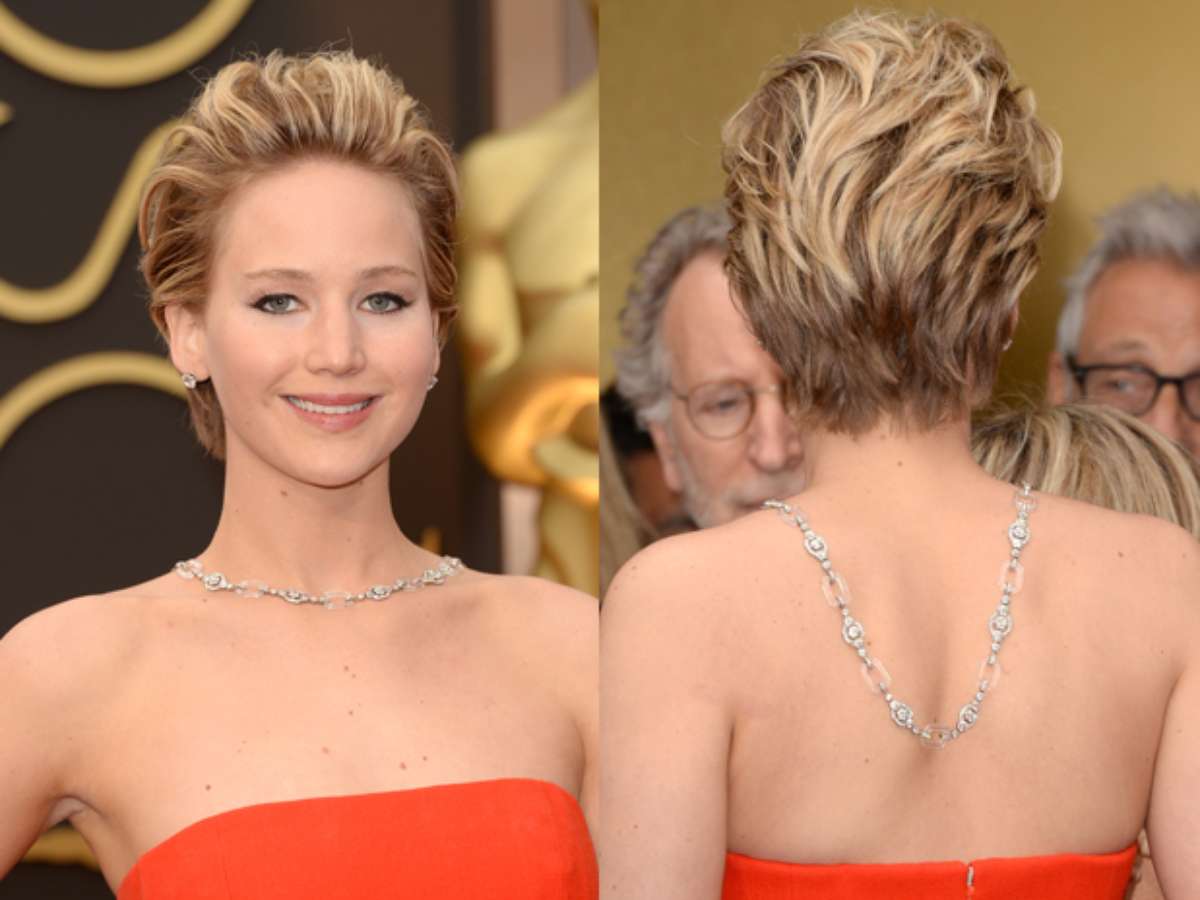 No Oscar 2014, Jennifer Lawrence ressaltou o corte pixie com tomara que caia e um colar discreto