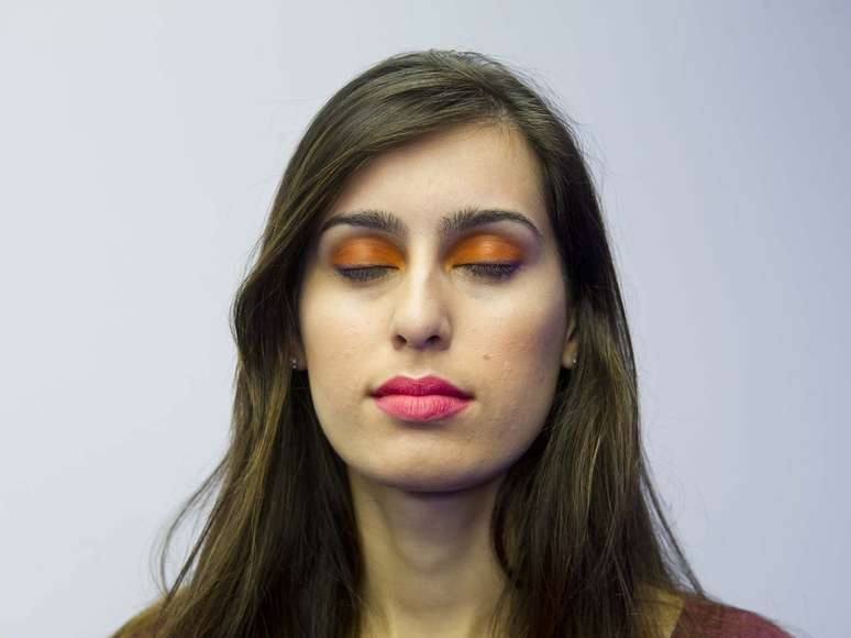 Para a maquiagem, foi escolhida a sombra laranja, que é espalhada de leve por toda a pálpebra móvel do olho - a parte que vai da raiz dos cílios até o côncavo. “O segredo para não ficar exagerado é que nunca a sombra ultrapasse a linha do côncavo”, alerta Sadi.