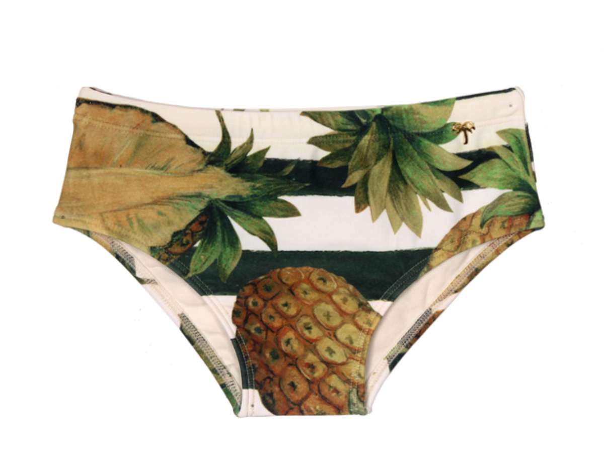 Sunga listrada com estampa de abacaxi, assinada pela estilista Liana Thomaz. Por R$ 149. Da Água de Coco. SAC: (85) 4008-0088