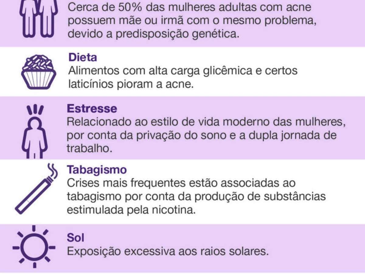 A piora da saúde da pele feminina vem sendo impulsionada por alguns fatores, como estresse, poucas horas de sono, alimentação ruim, exposição excessiva ao sol, medicamentos e cosméticos inapropriados. No entanto, doenças endocrinológicas e fatores genéticos também contribuem para o desenvolvimento do problema.