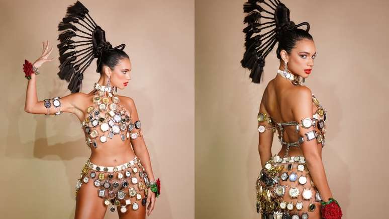Alane Dias inova e usa roupa com cerca de 400 relógios reciclados para ensaio de carnaval