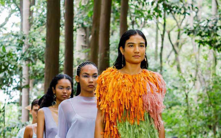 Outra estilista que usou os pigmentos de bactérias criados pela Aiper foi Flavia Aranha, que desfilou sua coleção no Parque Trianon, criando uma atmosfera de floresta em plena selva de pedra. "Mais do que a poética da floresta, é urgente exercitar uma sociedade em que o petróleo permanece debaixo da terra, e que as soluções venham da floresta viva, de pé. A moda precisa assumir compromissos com mudanças estruturais para conter a crise climática", afirmou Flavia.