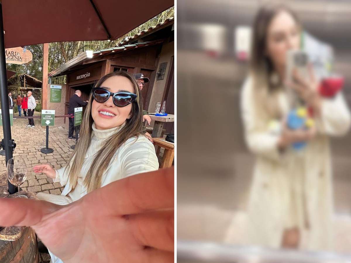 Para curtir um fim de semana friozinho diretamente de Curitiba, a influenciadora surgiu com visual formado por vestido curto de modelagem ampla e gola alta em tecido canelado, que foi combinado com sobretudo em tom de creme, idêntico a tonalidade presente na peça principal, que trouxe um ar ainda mais sofisticado para a produção.