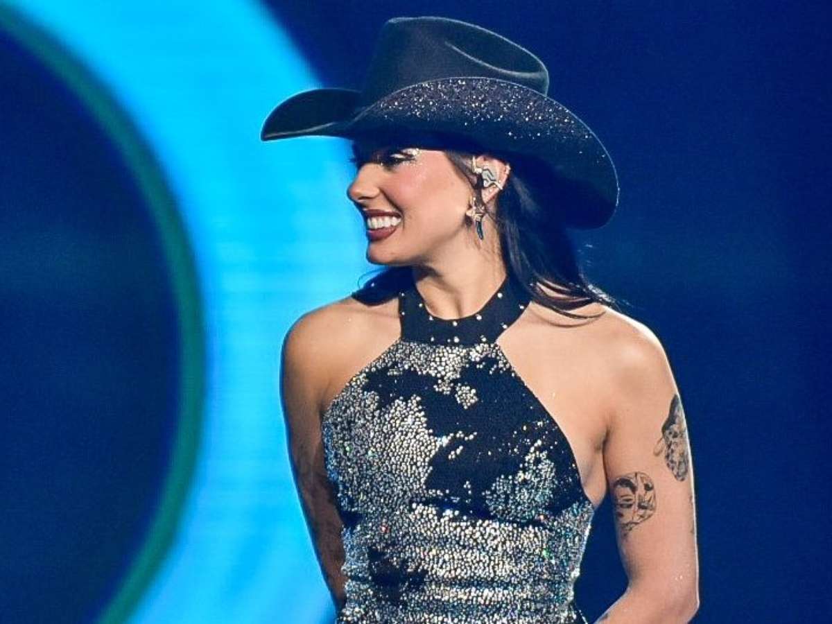 A Boiadeira não deixou de lado seu chapéu nem o brilho em seu look. Ana Castela usou conjunto de calça comprida e top de decote halter, deixando os ombros à mostra, para cantar ao lado de Naiara. O diferencial da produção foram os cristais, aplicados de forma localizada, formando manchas prateadas sobre o fundo preto, dando impressão de acabemento destroyed.