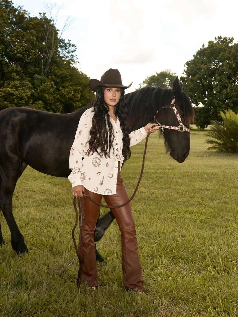 Sabe aquele look "limpo" mas cheio de presença? Ana Castela arrasa na camisa de botões branca com estampas discretas. A calça de couro marrom traz o peso do estilo western, enquanto as mangas dobradas dão um ar despojado.