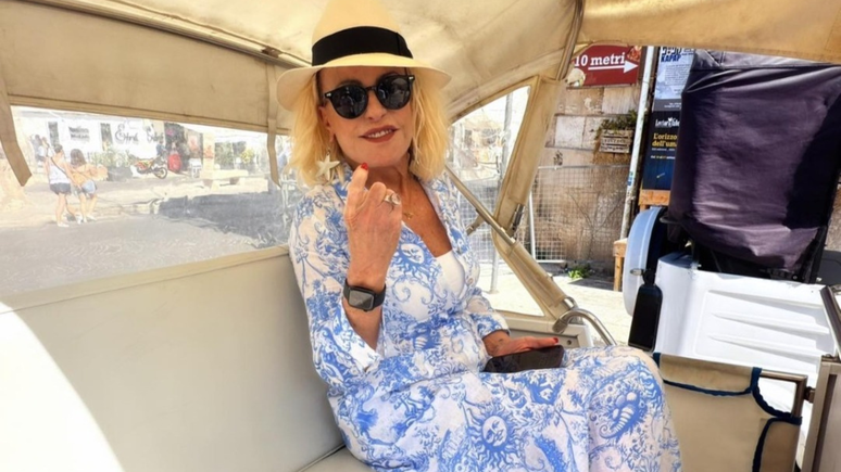 Ana Maria Braga acerta com 2 looks em azul e branco na Itália