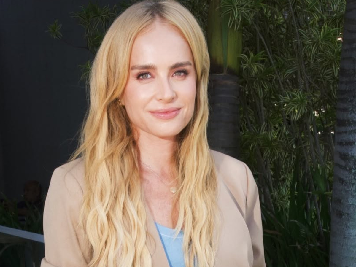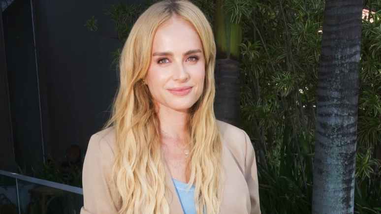 Os cabelos estavam soltos e ondulados. A maquiagem seguiu a proposta leve, finalizada com batom nude (tom próximo ao da pele dela).