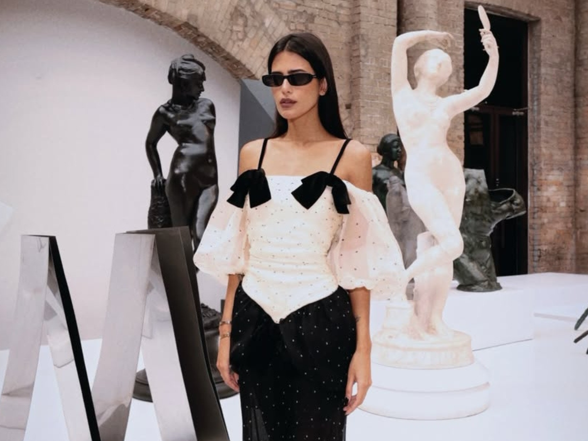 Anttónia investiu em poá (bolinhas) com fundo branco na parte de cima e preto na de baixo. O look conta com o romantismo dos laços e volume no quadril.