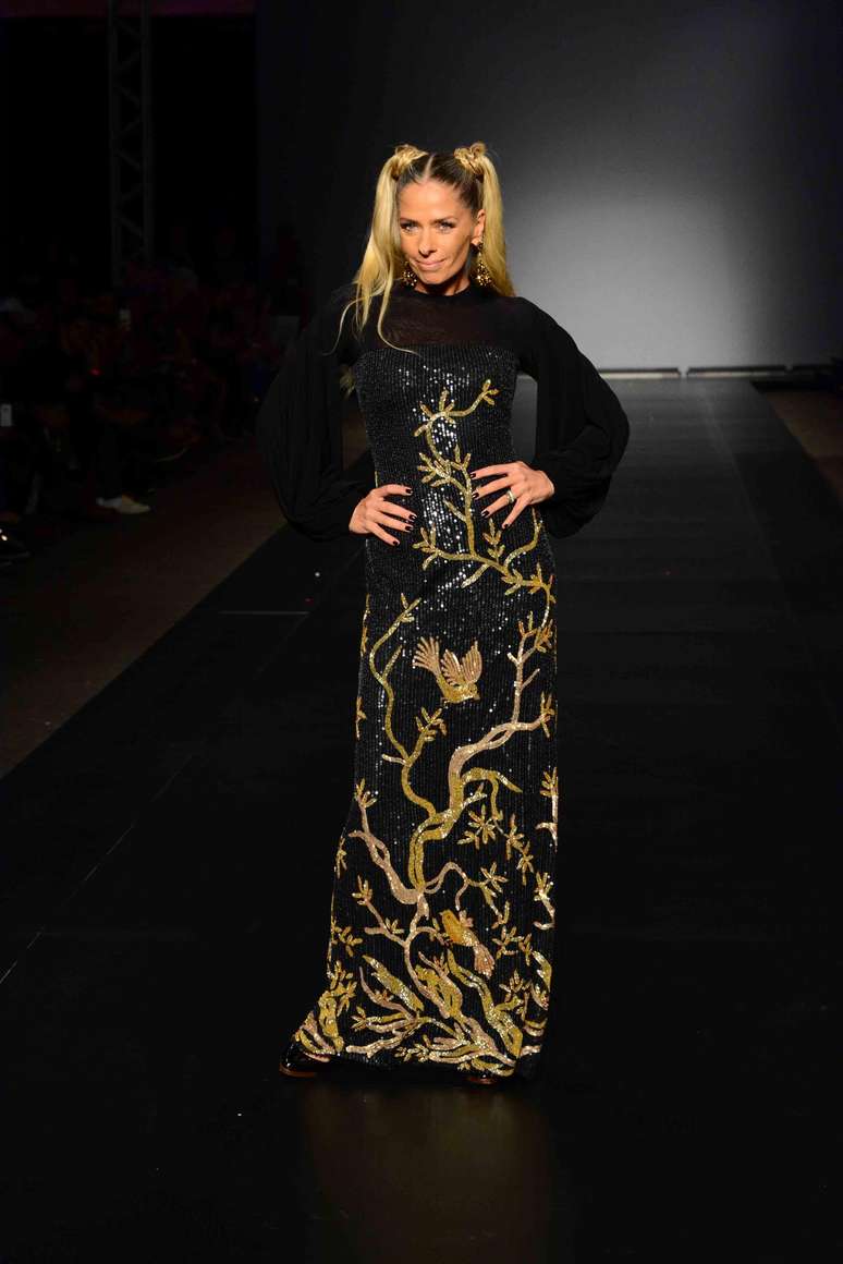 Adriane Galiseu desfilou vestido poderoso inteiro bordado de preto com desenhos de galhos e pássaros.