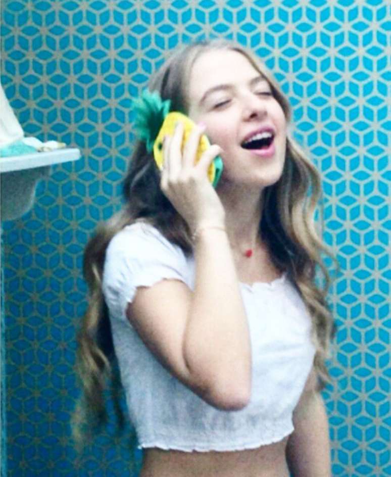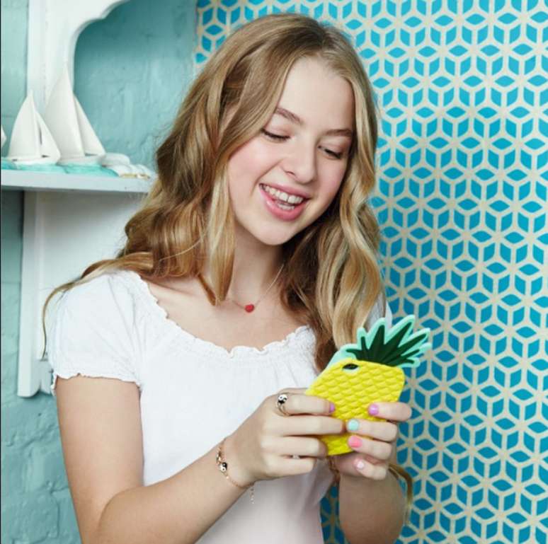 Nas fotos, ela aparece usando calça jeans, blusas que deixam parte da barriga de fora e fazendo poses descontraídas com os enfeites de cabelo, colares, brincos, aneis e capinhas de celular da marca.
