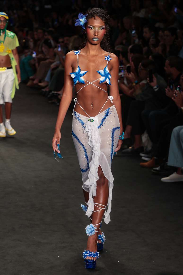 A mãe de Tici Pinheiro também desfilou com maiô cavado, com a inscrição "Ipanema", e saída de praia longa com a bandeira do Brasil estilizada como estampa, encerrando a apresentação com a neta, Bruna Pinheiro. Aliás, o chamado brasilcore (tendência que tem as cores brasileiras como destaque) tomou conta da passarela, que contou também com nomes como Deborah Secco, Pocah, entre outros famosos, e uma legião de modelos de várias silhuetas, refletindo a diversidade das praias brasileiras, como proposto pela diretora criativa Sharon Azulay.