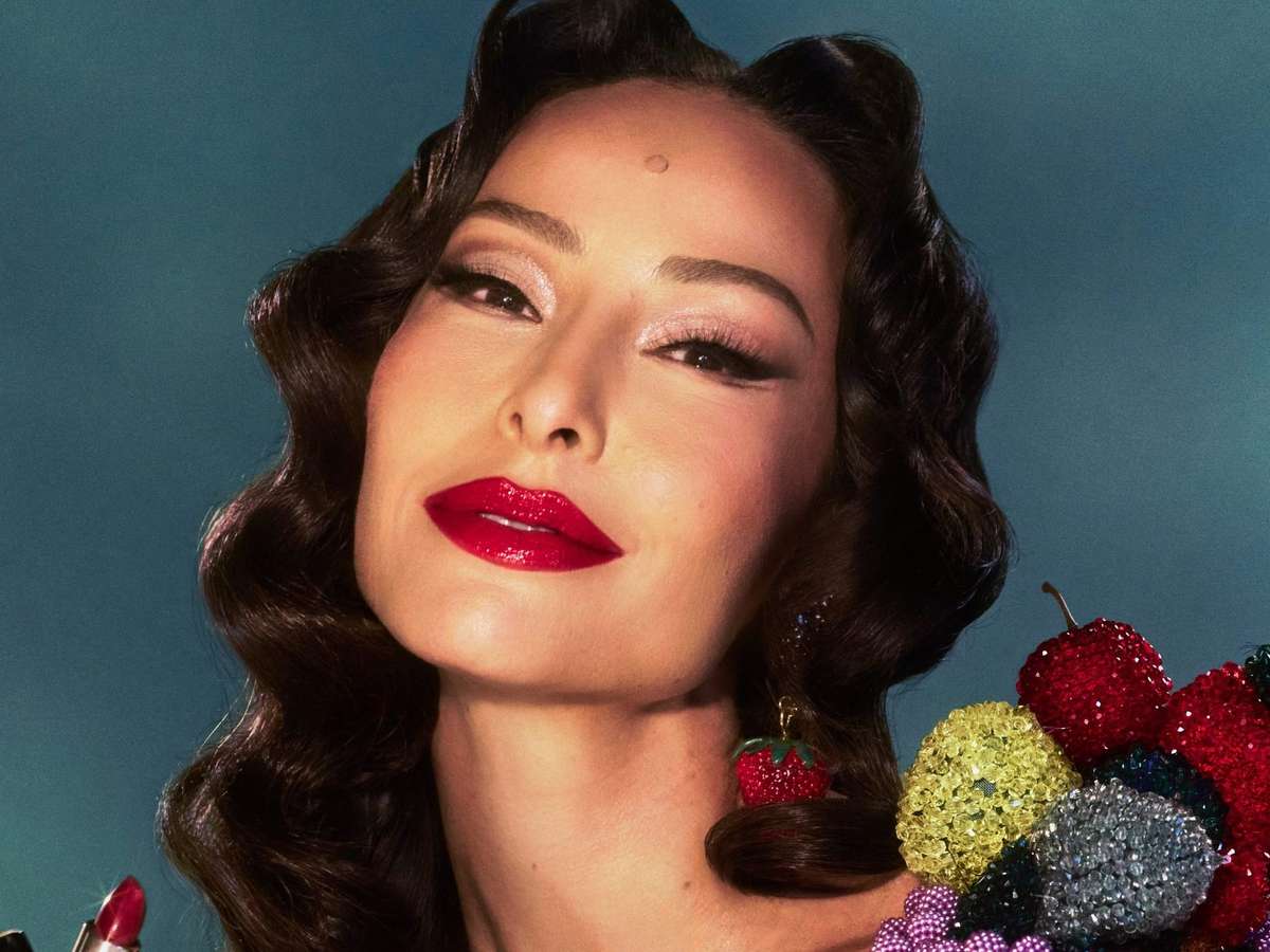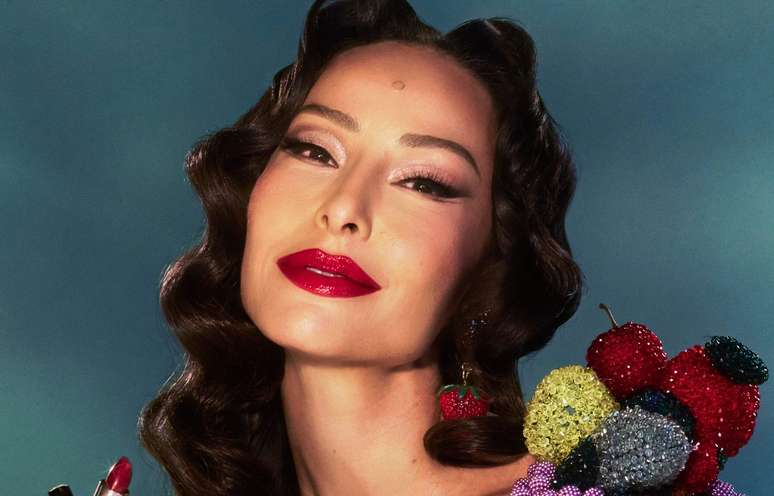 O styling foi complementado por meias pretas acima do joelho e sandálias de salto fino com aplicações de cerejas, em diálogo direto com o conceito da produção. O cenário reforça essa narrativa com a apresentadora apoiada sobre uma grande maçã cenográfica, elemento que amplia o caráter lúdico do visual e conecta figurino e ambientação em uma mesma linguagem estética. O look é assinado pela marca espanhola Aurela Hoxha.