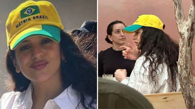 O boné que ROSALÍA foi fotografada usando em um restaurante ontem em São Paulo, representa a "Mátria Brasil", peça política brasileira usada por Janja e apoiadores de Lula.