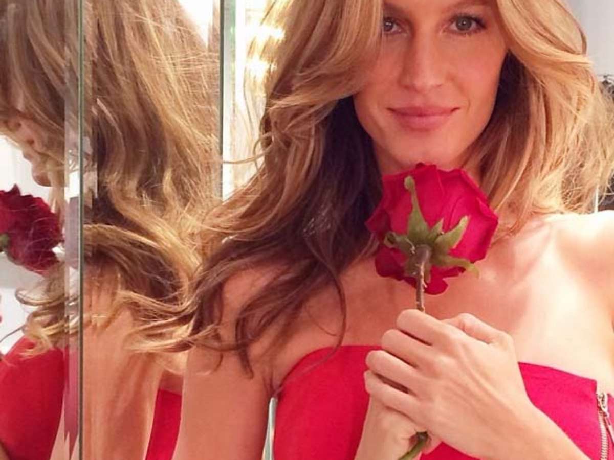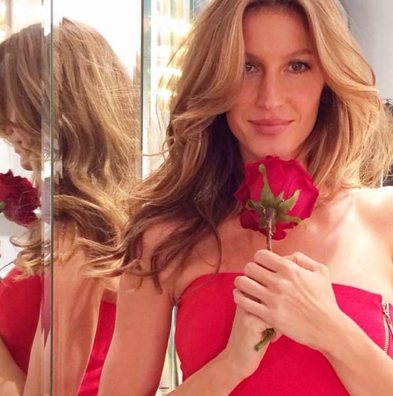Na imagem, Gisele aparece com um vestido vermelho tomara-que-caia e segura uma rosa da mesma cor. A apresentação pela Colcci marcou a volta da top às passarelas brasileiras após dois anos. Gisele fez duas entradas durante o desfile e, ao final, foi ovacionada pelo público.