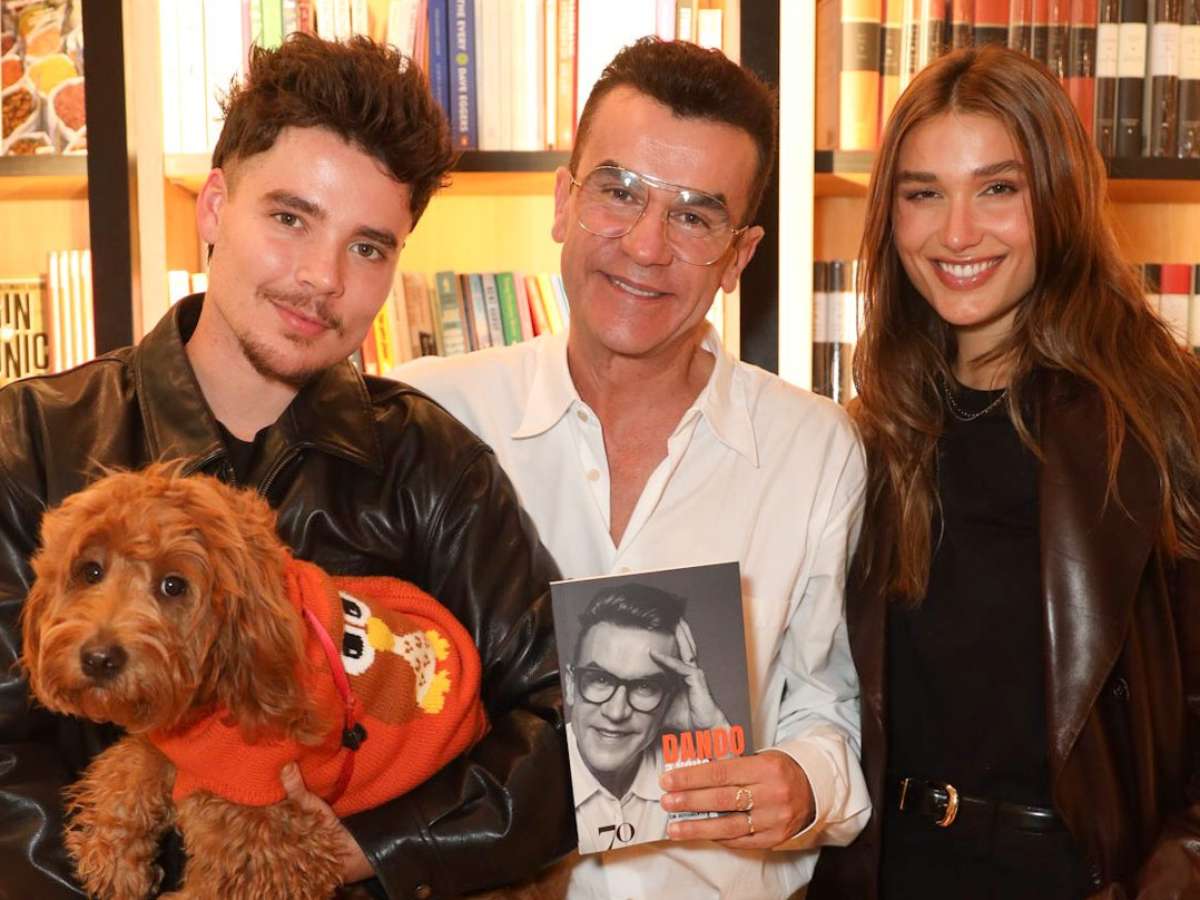Monica Martelli, amiga e agenciada de Dando, e que escreveu a apresentação do livro, apostou em terno e bolsa da Gucci, completando com blusa de gola alta e sapato bordôs.