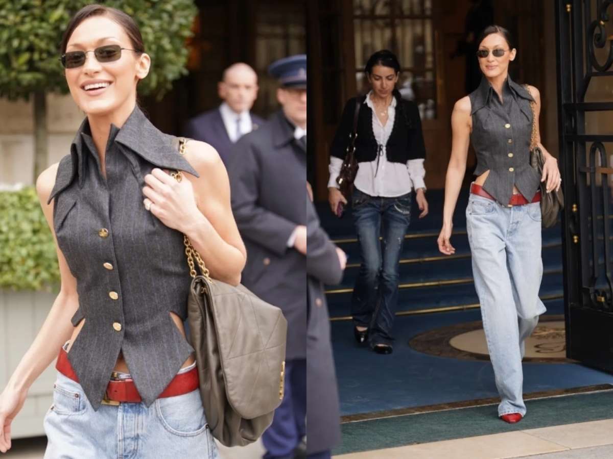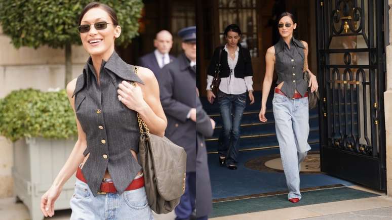 Diferente de Zendaya, que optou por um visual completo do desfile, Hadid escolheu um estilo mais descontraído para combinar com seu colete vintage. Ela o complementou com jeans de lavagem clara e caimento solto, ajustados por um amplo cinto de couro vermelho. A harmonia das cores continuou com seus elegantes sapatos kitten heels vermelhos.