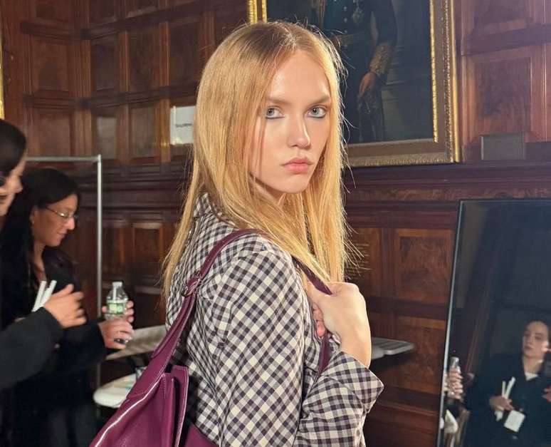 Gabriela Nied, de 21 anos, que é natural de Lajeado (RS), desfilou com look xadrez, composto por jaqueta fechada e saia de cintura baixa, contrapondo com bota preta de cano alto.