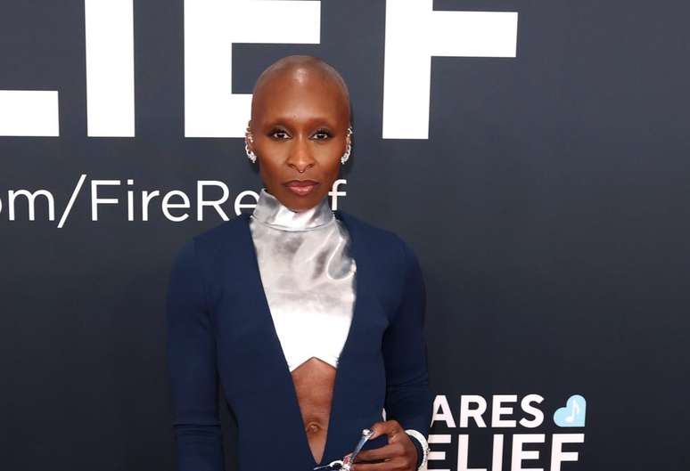 Cynthia Erivo usa vestido de manga comprida e cauda com corpete metalizado, da Louis Vuitton.