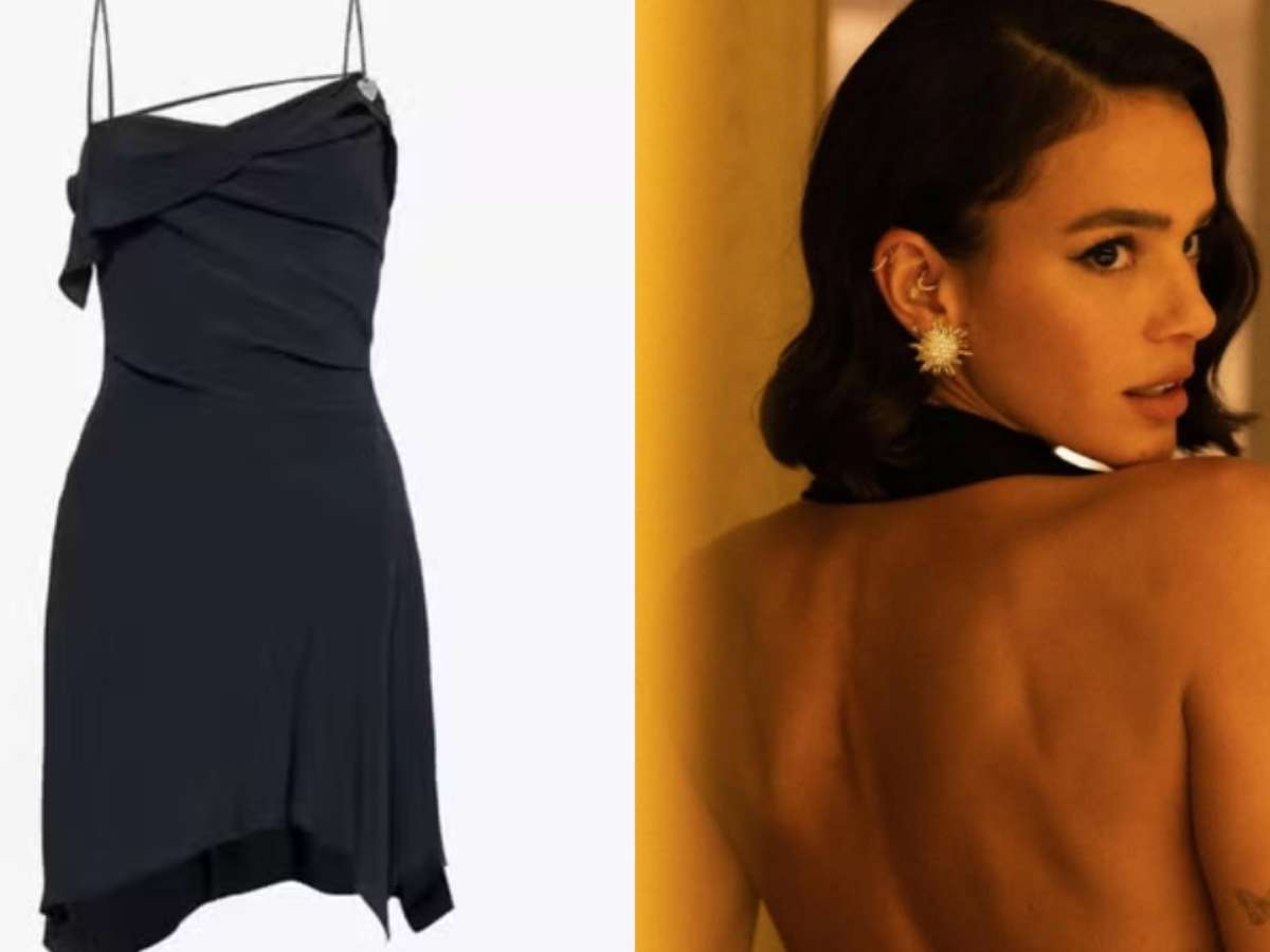 Para uma das festividades, Bruna optou por um sofisticado vestido preto da renomada grife Acne Studios. O modelo, que se destaca por seu design strapless, apresenta um corte minimalista que reflete as características icônicas da marca sueca.