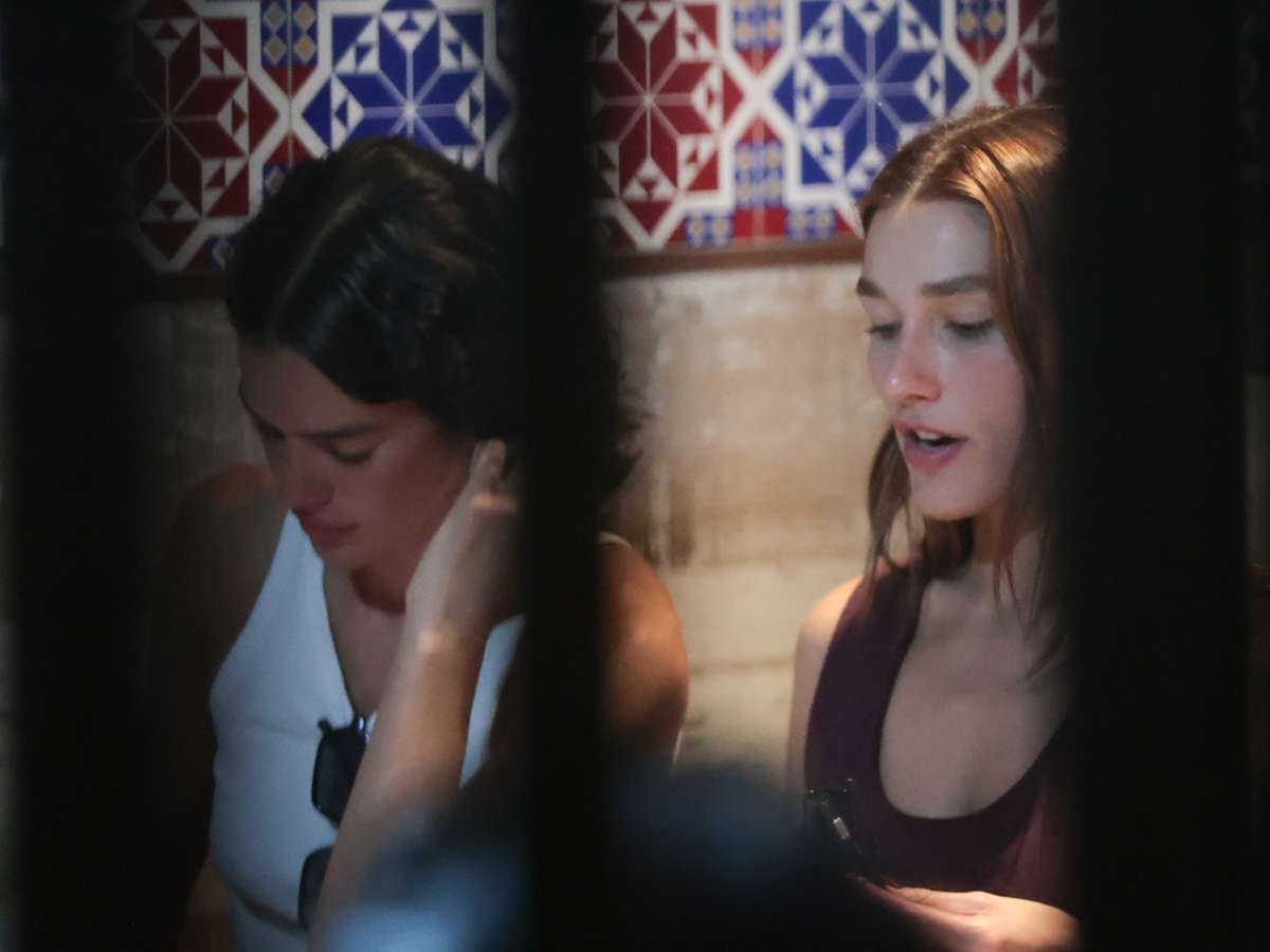 A estilista também completou a produção com chinelos de dedo pretos, iguais aos da atriz. Já os homens usaram bermudas e camisetas brancas e também optaram por chinelos.