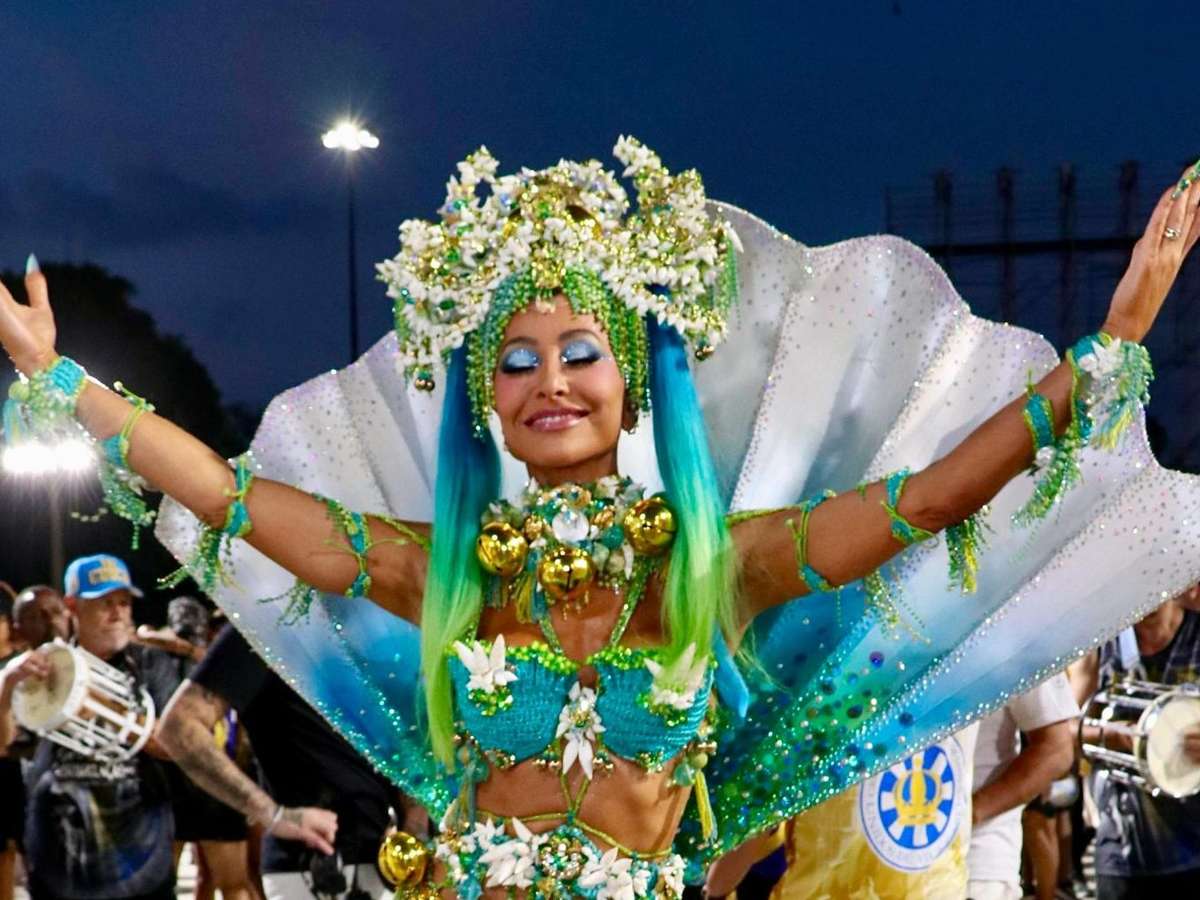Paolla Oliveira entrou no ritmo do carimbó com biquíni rosa, com tiras e brilhos, além de cabeça da mesma cor. Em alguns momentos, usou a saia ampla e florida, que representa o movimento de dança típico do Pará. O enredo do Carnaval de 2025 da Grande Rio é ""Pororocas Parawaras: As Águas dos Meus Encantos nas Contas dos Curimbós".