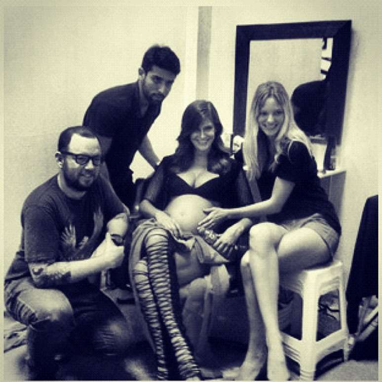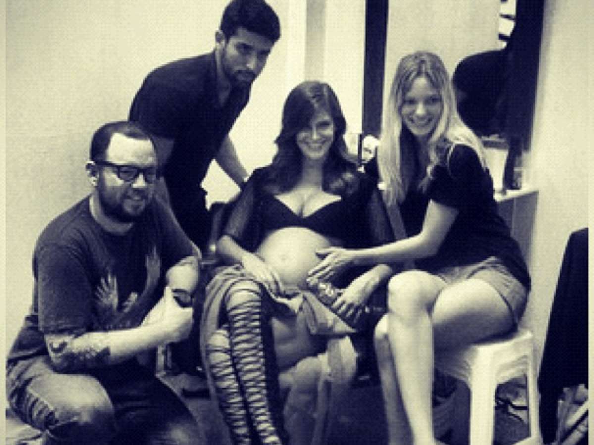 Ela posou com o barrigão à mostra ao lado da equipe de produção e também usou vestidos longos e com leve transparência