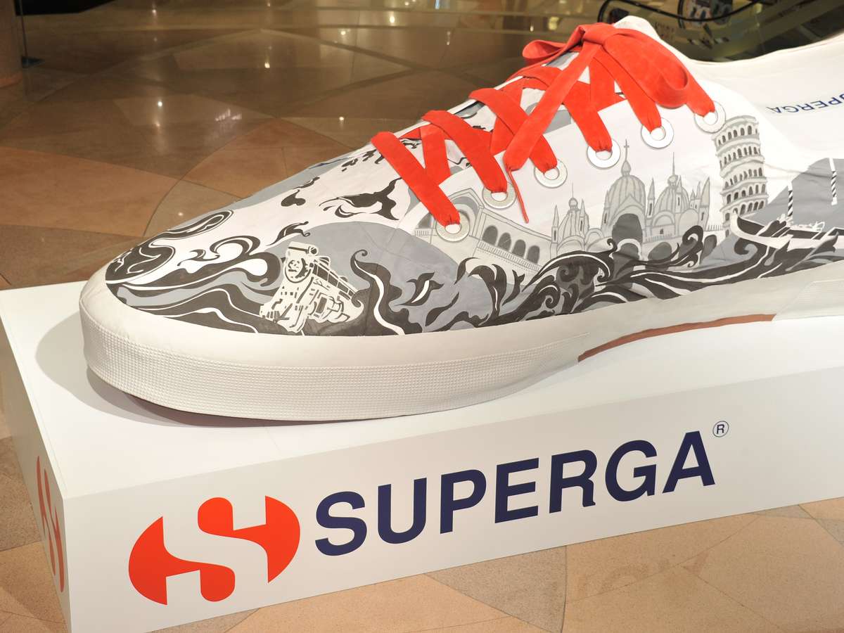 Impossível de ser calçado perfeitamente no pé de um ser humano, o maior tênis do mundo tem 6 m de comprimento. A grife italiana Superga criou a réplica do modelo 2750 para expor o tênis na cidade de Harbour, em Tsim Sha Tsui, Hong Kong, e marcar sua entrada no mercado Chinês.