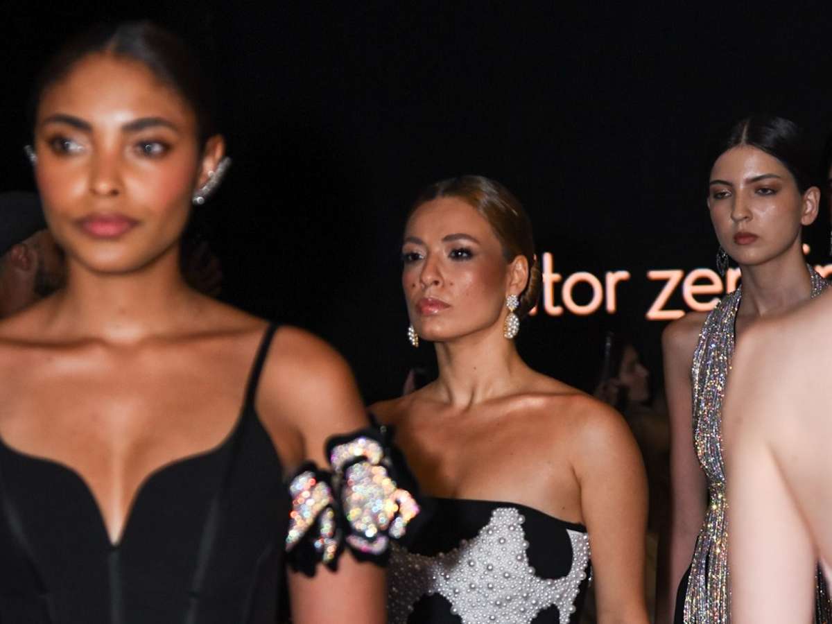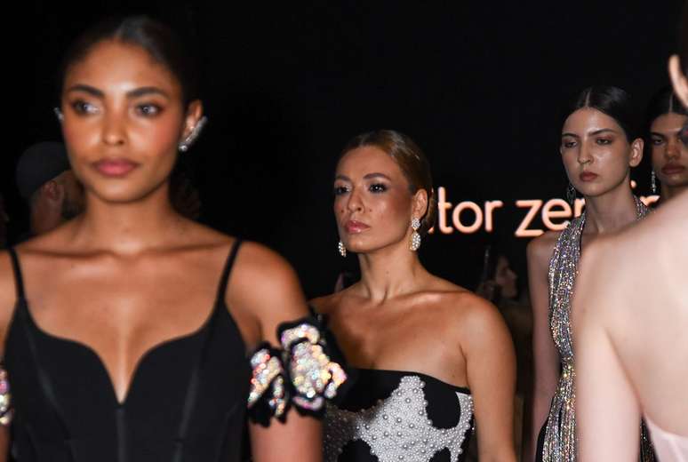 O desfile aconteceu durante o evento Celebration Bride, no Hotel Unique, organizado pela joalheira Bibiana Paranhos, que também assinou as joias dos looks. A ex-BBB Bia desfilou com um vestido curto bordado com milhares de pérolas em diferentes tamanhos, que formavam maxipoás pretos nos espaços vazios do tecido.
