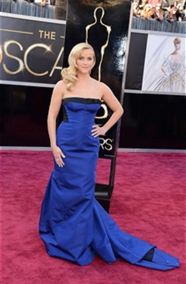A atriz Reese Witherspoon em um vestido azul tomara-que-caia da Louis Vuitton, usado na cerimônia do Oscar