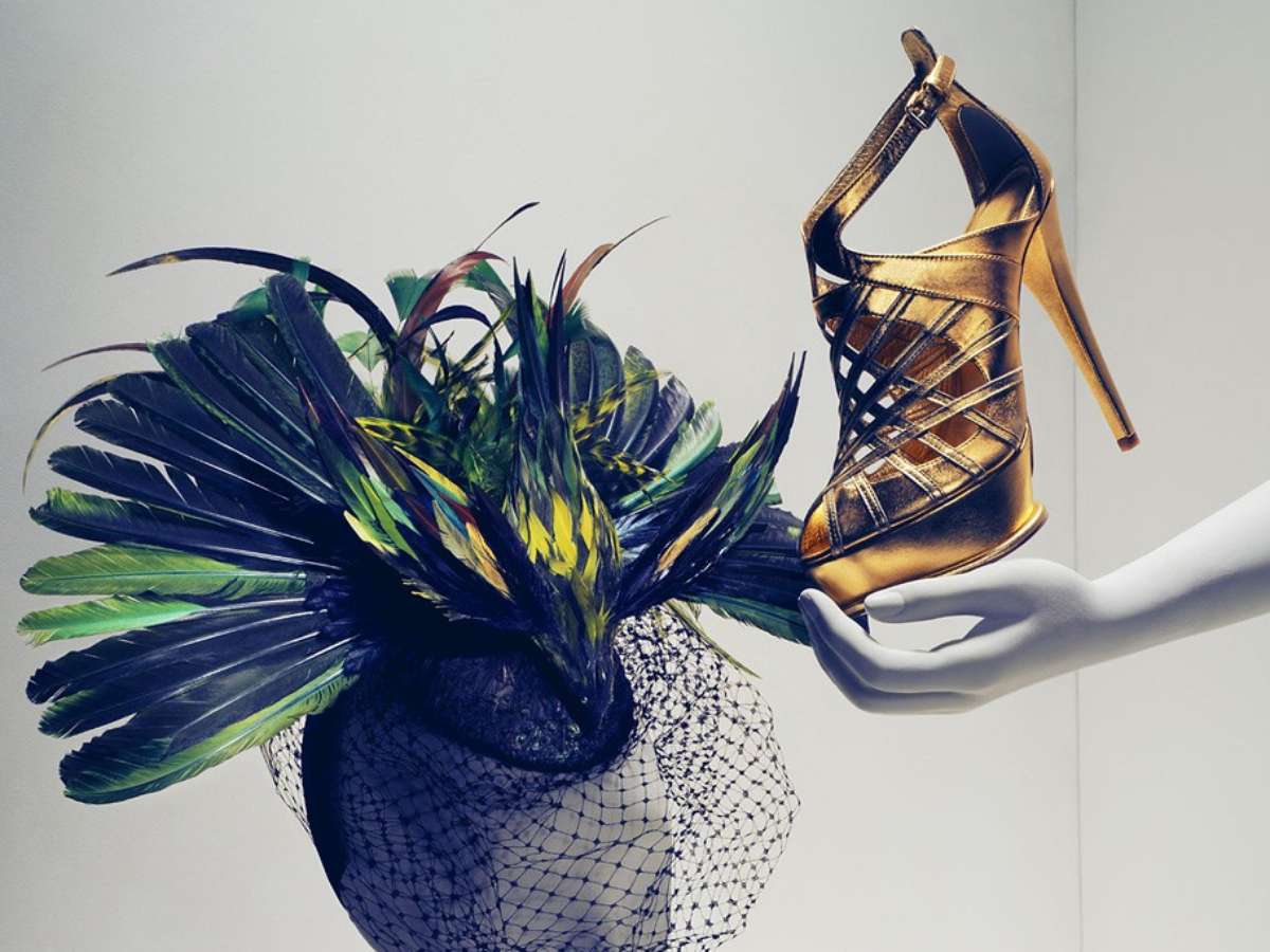 Fascinator com ave falsa empalhada e sandália dourada são itens da linha de acessórios criadas por Anna Dello Russo para a H&M