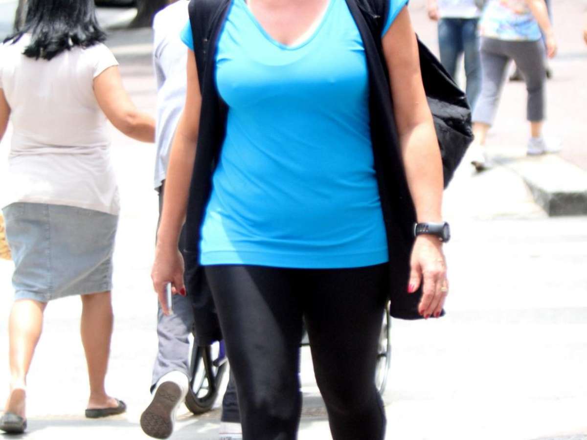 Adriana Esteves mantém a silhueta miúda com caminhadas na orla carioca e usa top com duas camadas de tecido, o que confere mais sustentação e calça legging no mesmo tom. A camiseta na cintura é um recurso comum usado pelas mulheres, para esconder o bumbum