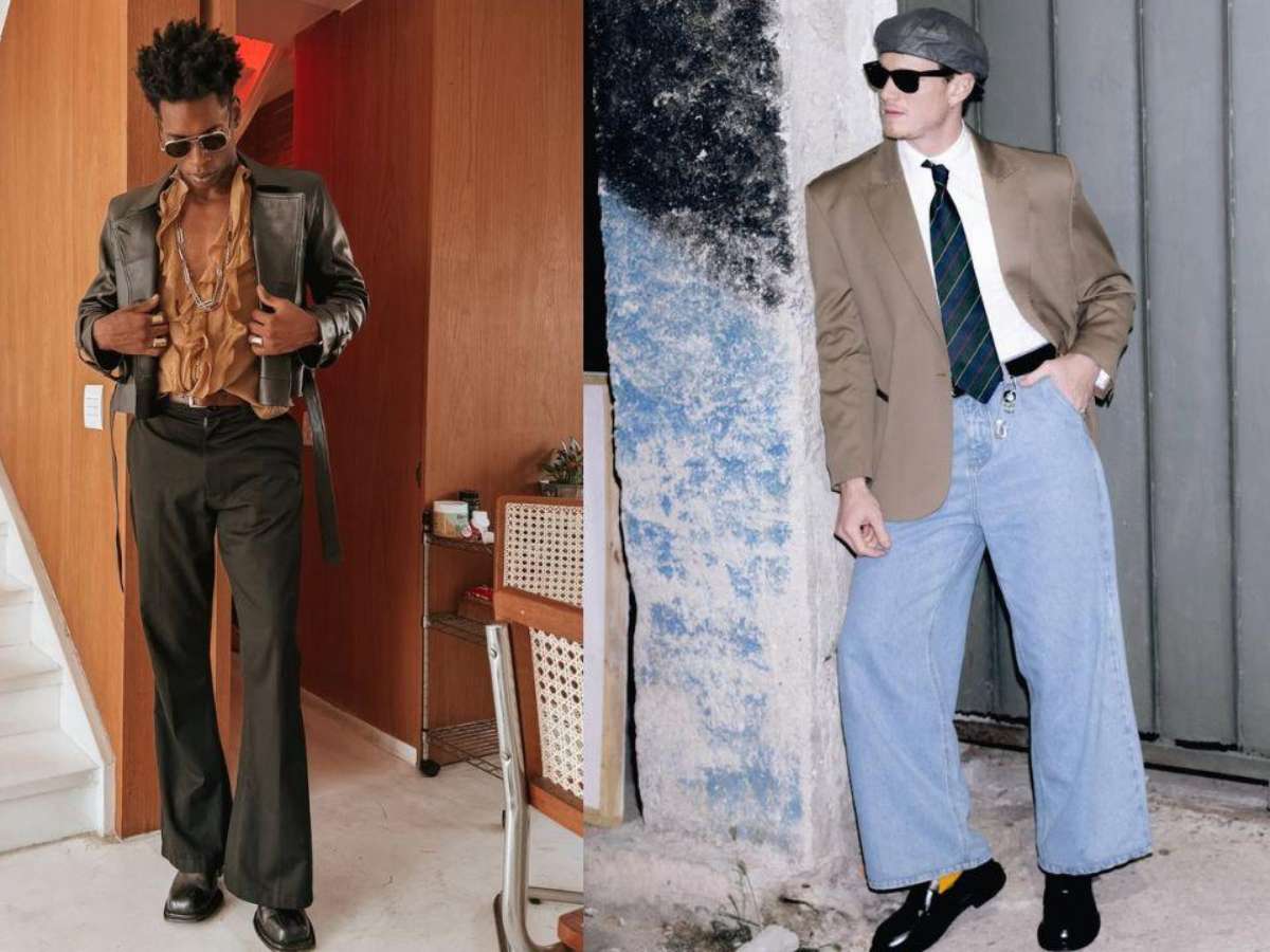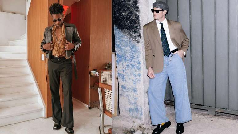 Camisas de botão com estampas discretas e calças com cortes mais retos são peças-chave. Eles conseguem misturar o antigo com o novo de forma muito natural.