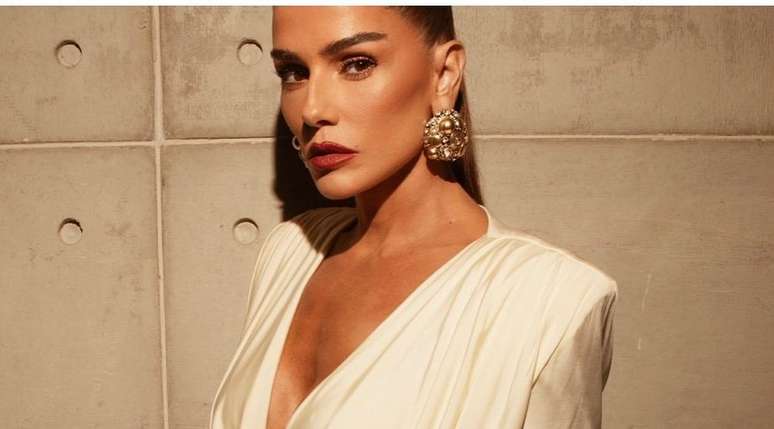 Para o programa, a atriz usou um vestido off-white, curto, com drapeado frontal, com decote em V profundo, da marca Magda Butrym, que custa R$ 12.925, na loja online Farfetch no Brasil. Completou com sapato do mesmo tom da New Bottega e acessórios da marca norte-americana Area.