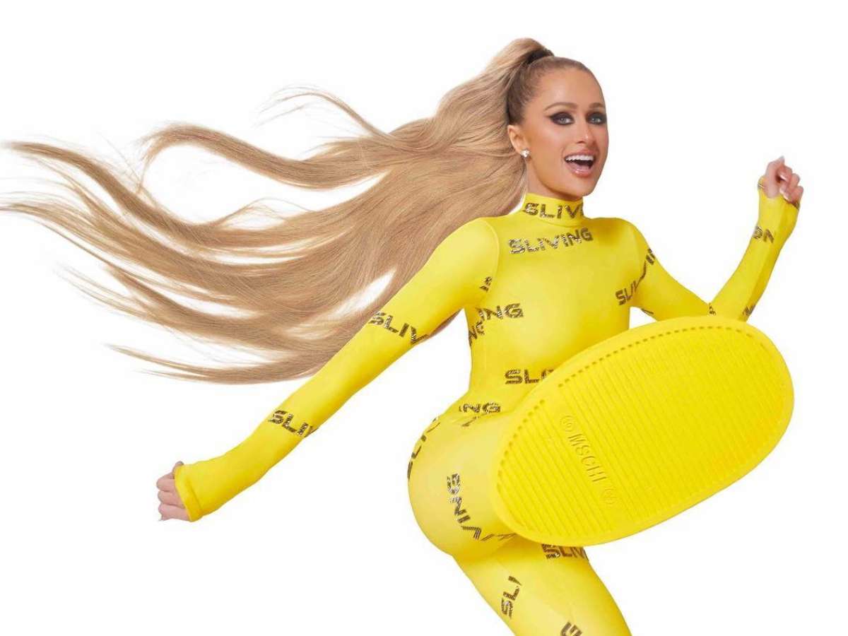 E escolheram como garota-propaganda do novo produto, criado coletivo fundado em 2016 e sediado no Brooklin, em Nova York, nada menos que Paris Hilton. A socialite e influencer loira foi fotografada na campanha com um macacão amarelo do tom da bota, com a palavra "sliving" aplicada com cristais.