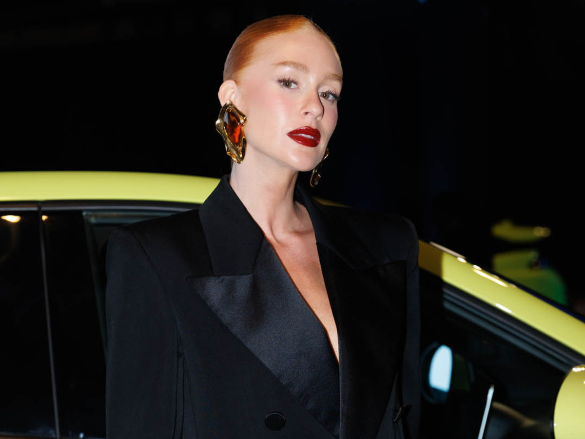 Marina Ruy Barbosa provou a elegância do all black (tudo preto) com vestido tipo blazer. Também estava com meia-calça e sandália de salto alto. Para finalizar, maxibrincos.