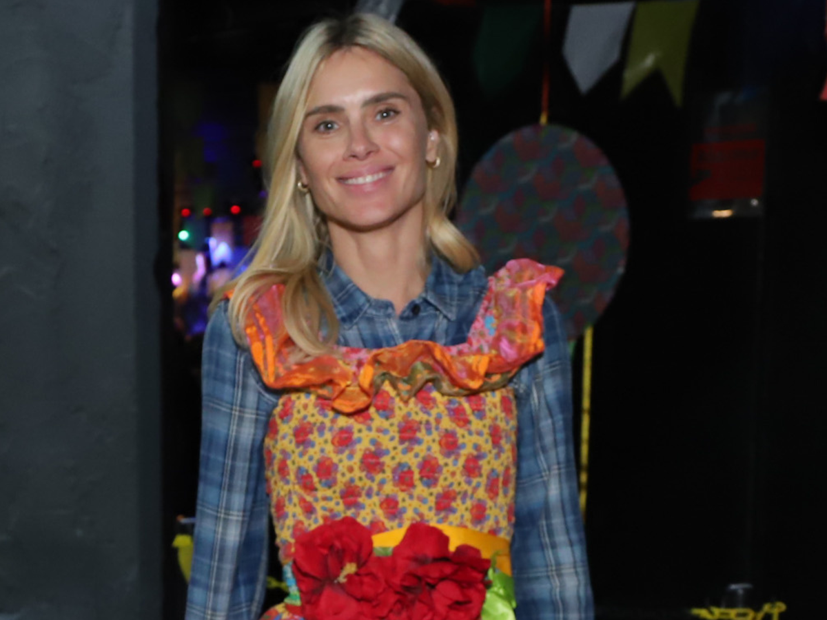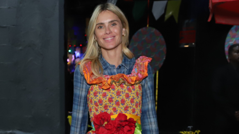 Carolina Dieckmann usou vestido típico de caipirinha, com estampa floral, babados e aplicações de flores em 3D. Por baixo, incluiu camisa xadrez. E finalizou com bota areia na altura do joelho.