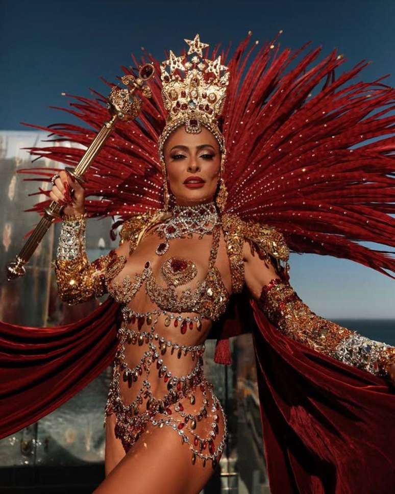 Juliana trouxe o luxo italiano para a folia. O look assinado pela Dolce & Gabbana era repleto de pedrarias e brilho extremo.