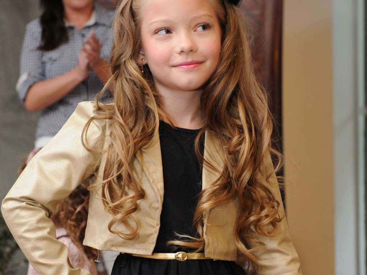 A sobrinha da top Gisele Bündchen foi ao evento acompanhada dos pais e usou vestidinho preto com meia-calça, cinto e jaqueta dourados.