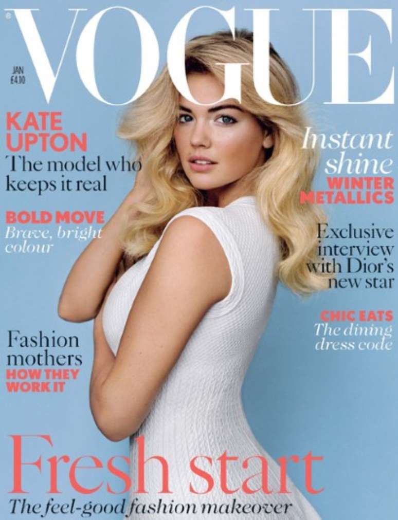 A modelo americana Kate Upton, apontada como a quinta mais sexy do mundo pelo site Models, foi fotografada para a capa da Vogue inglesa de janeiro. Segundo a editora da revista, Alexandra Shulman, a escolha se baseou nas curvas da top. "Quando decidi fotografar Kate para a primeira capa de 2013 foi para começar o ano com uma mulher jovem que não se encaixa no estereótipo de uma modelo, apesar de que, vamos admitir, ela não é nada elefante", escreveu na edição.