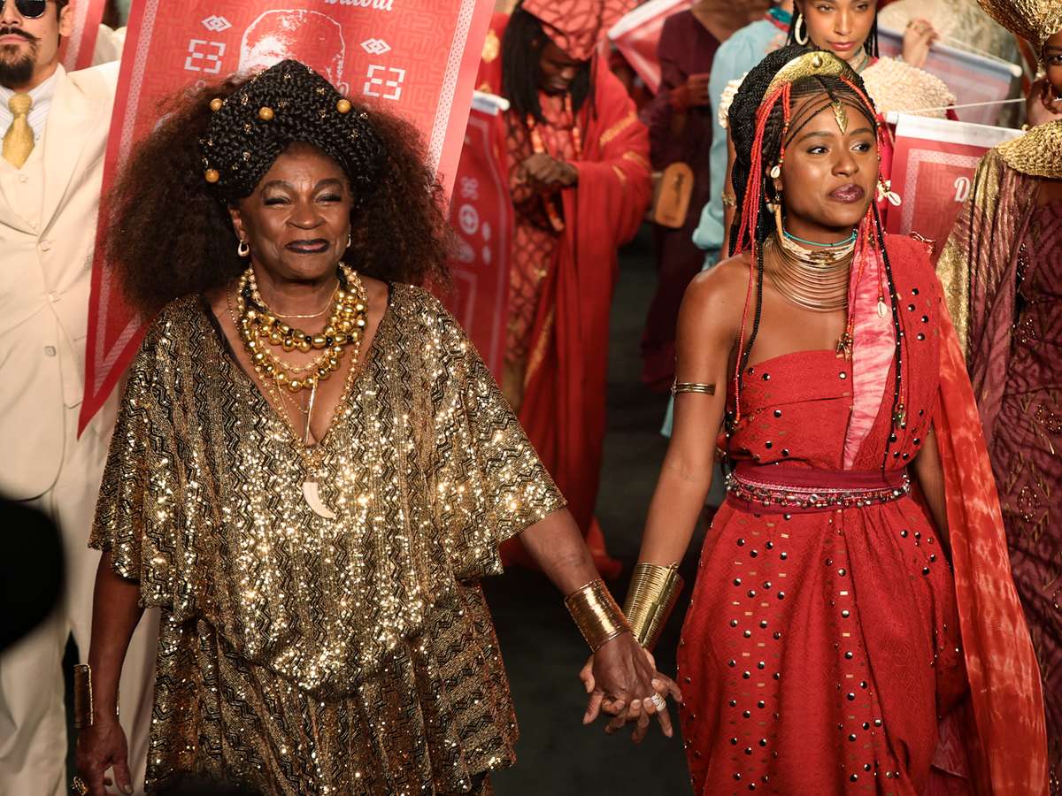 Na passarela, o elenco sustenta essa narrativa. Além de Duda Santos (Alika/Lúcia), desfilaram Fabiana Karla (Graça), Hilton Cobra (Chinua), Lázaro Ramos (Jendal), Licínio Januário (Dumi), Nicolas Prattes (Mirinho), Nikolly Fernandes (Kênia), Rodrigo Simas (Omar), Ronald Sotto (Tonho), Theresa Fonseca (Virgínia) e Zezé Motta (Dona Menina), que ainda fez uma entrada potente, reforçando a ancestralidade no desfile.