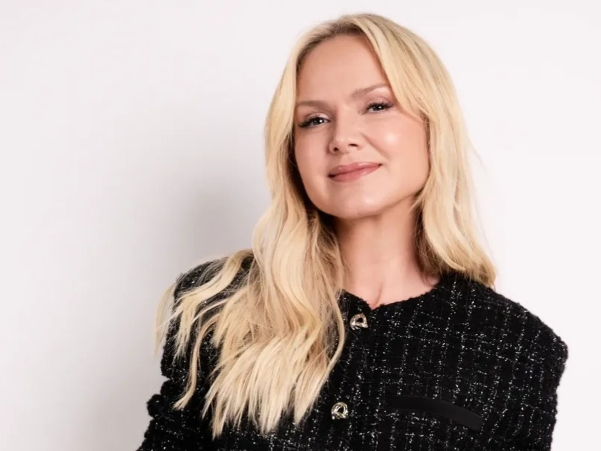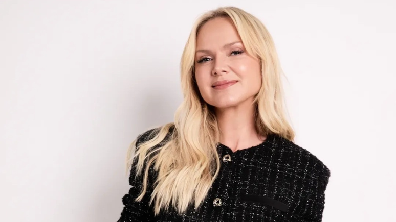 A apresentadora investiu em look preto com leves toques de branco em tweed, da Boss. Completou com meia-calça preta e escarpim marrom. As joias são de Emar Batalha. Juliana Maia assina o styling.