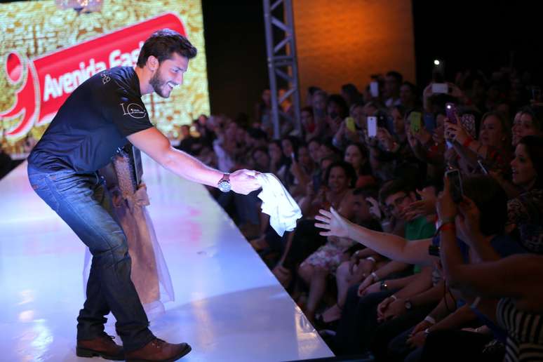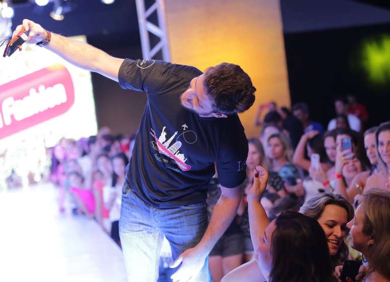 Simpático, ele subiu à passarela distribuindo sorrisos e chegou a tirar selfies com as fãs que o prestigiavam no local. Ele também presenteou algumas mulheres com camisetas e segurou uma criança no colo.