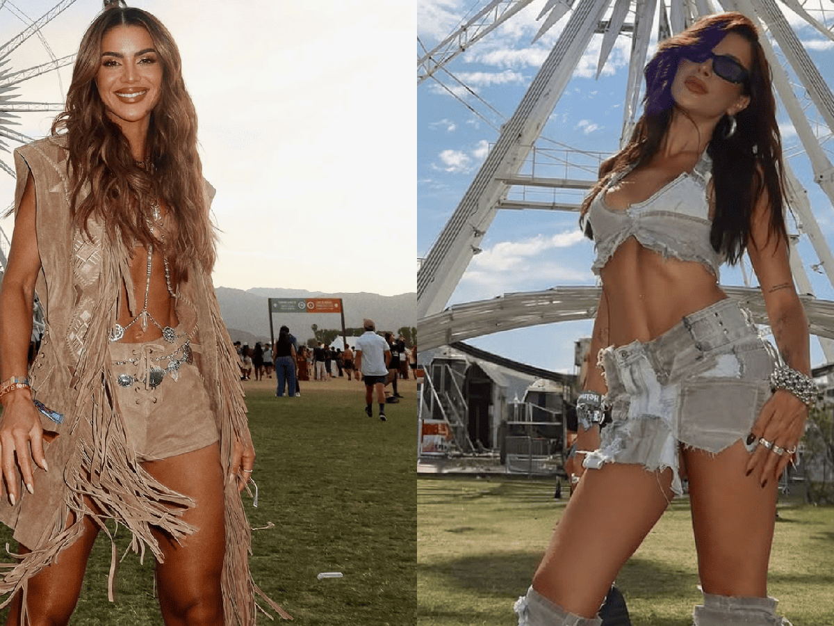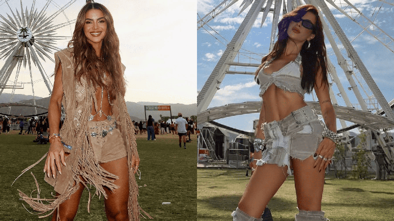Camila Coelho foi outra que esteve presente no evento e ressurgiu a estética country, uma das mais usadas pelo público durante o final de semana. A influenciadora apostou em um conjunto de biquíni e shorts com uma sobreposição em camurça, que contava com franjas e bordados na altura do ombro. Além disso, botas no estilo cowboy, com detalhes em metal, também compuseram o look.