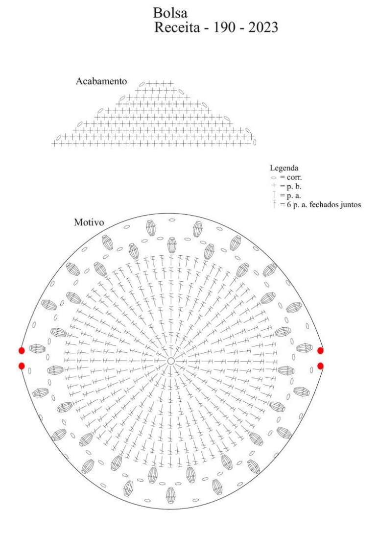 Acabamento - Faça a toda a volta do início do trabalho o acabamento superior seguindo o gráfico. O gráfico do acabamento deve dar a volta toda do início da peça. Faça o acabamento de modo que o centro de uma das cava fique na mesma direção da abertura inferior da lateral. Terminado o gráfico rem..Alça - Prenda o fio em um dos pontos em vermelho do acabamento da borda superior e faça uma corr. com 40 cm e rem., deixe uma sobra de fio para prender o pingente. Faça uma corr. igual para cada pontos em vermelho. Pingente - Corte 22 fios com 30 cm cada fio e faça 1 pingente seguindo a receita. Terminado o pingente apare as pontas do fioe prenda na ponta de uma corr. de uma da alça. Faça mais 1 pingente para cada alça. Franja - Corte 4 fios com 48 cm de comprimento e faça a franja na borda dos dois lados da abertura da lateral a franja seguindo a receita. A franja pronta fica com aproximadamente 24 cm de comprimento. Faça 2 franjas em cada carr..