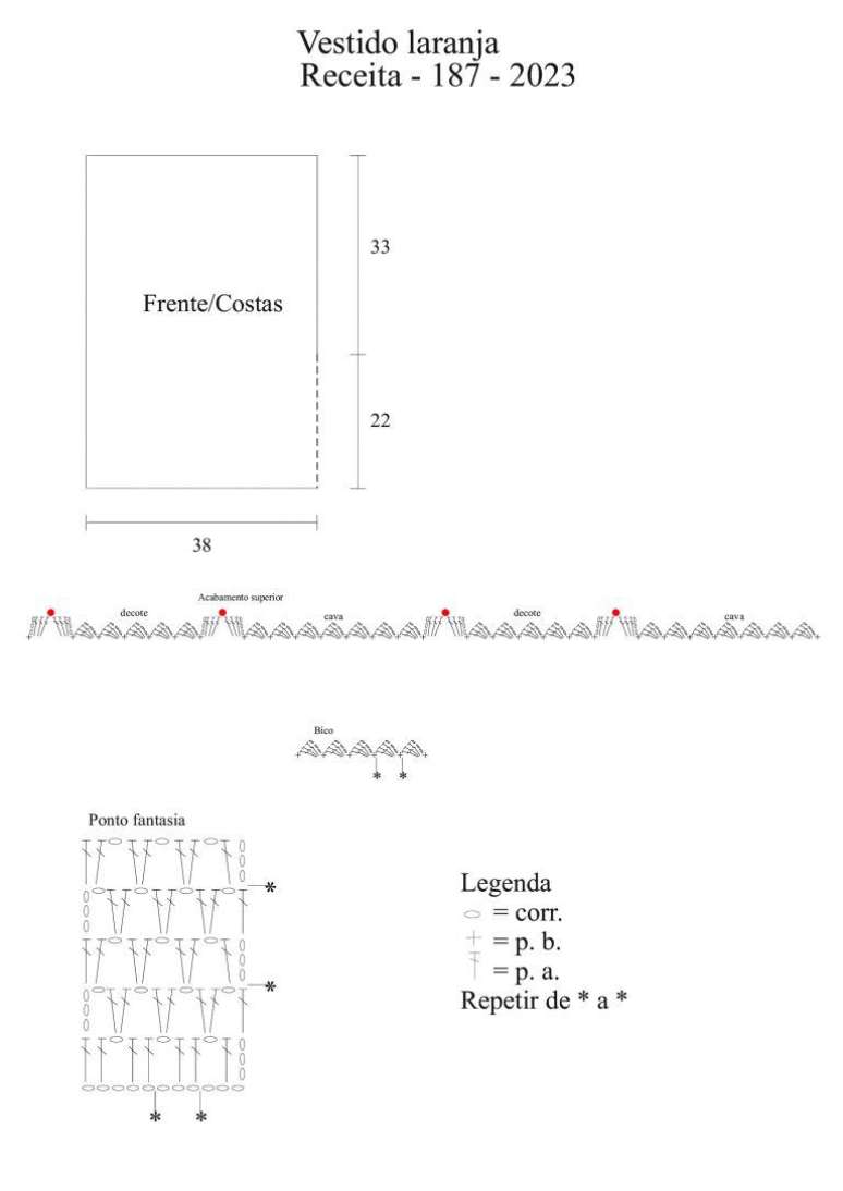 Execução - Vestido - Frente e costas - São trabalhadas juntas. Comece pelo decote. Faça uma corr. de 123 p. feche em círculo e trabalhe em p. fantasia seguindo o gráfico, repita de * a * no sentido dos p. (41 v.). Feche todas as carr. com 1 p. bxmo. e inicie a próxima carr. com 3 corr. A 33 cm do início do trabalho trabalhe em carr. de ida e volta para a abertura inferior da lateral.A 55 cm do início trabalhe o bico seguindo o gráfico, repita de * a * (22 v.). Terminado o bico rem..