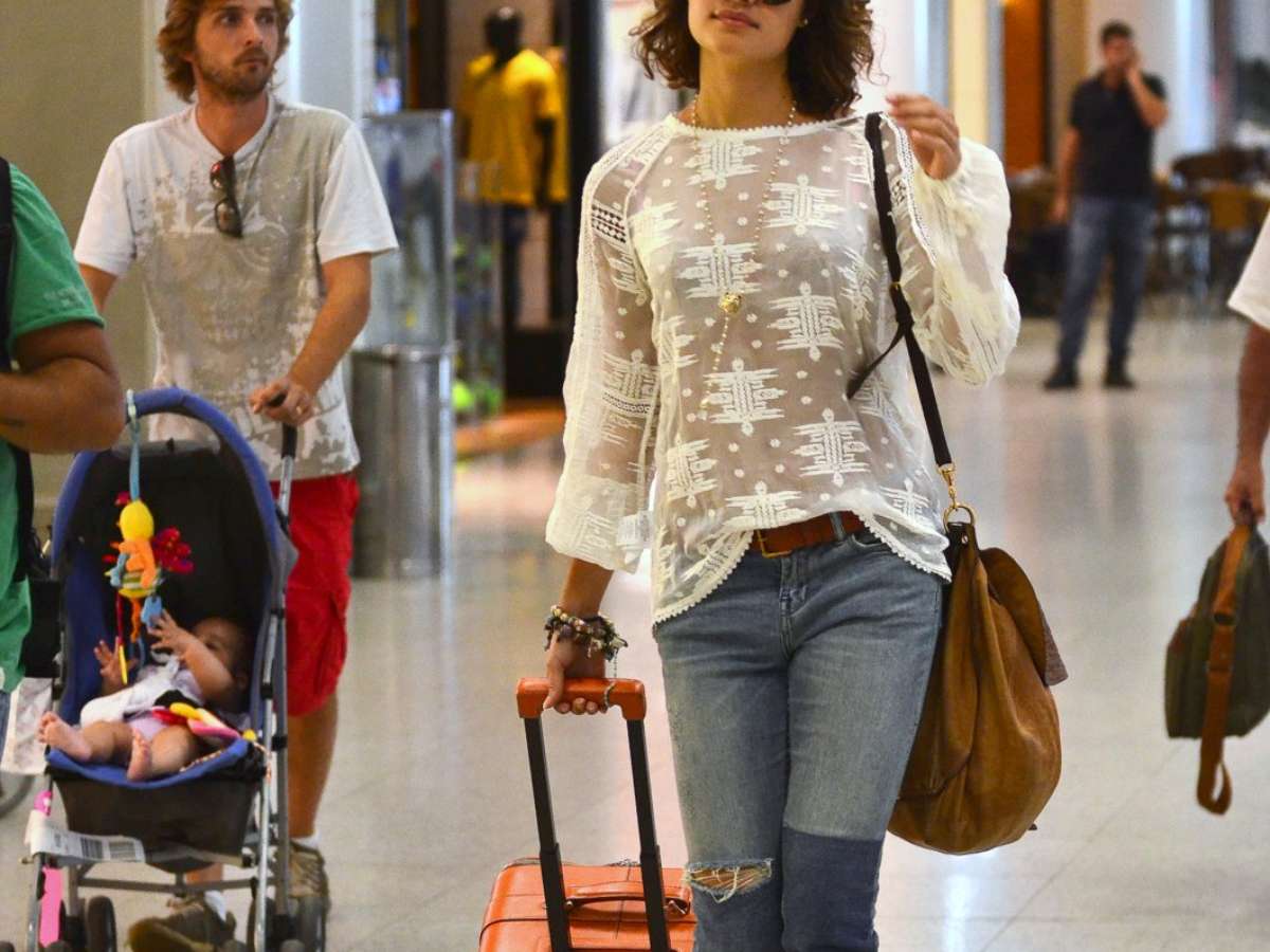 A atriz Grazi Massafera viajou muito esta semana. Numa das vezes, usou saia estampada com regata: roupa superprática para a ocasião. A bolsa pequena combinou com o look, mas Grazi, cuidado, é melhor não deixar o fecho aberto: é um passo para acontecer o que não se quer, justamente numa viagem. Imagina perder os documentos