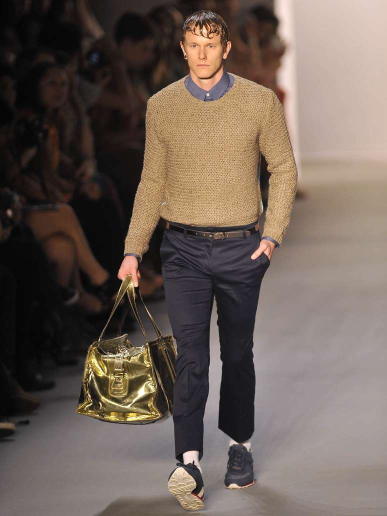 A grife, voltada para o público masculino, apresentou muitas calças com um quê mais "feminino", de cintura baixa e com as meias à mostra