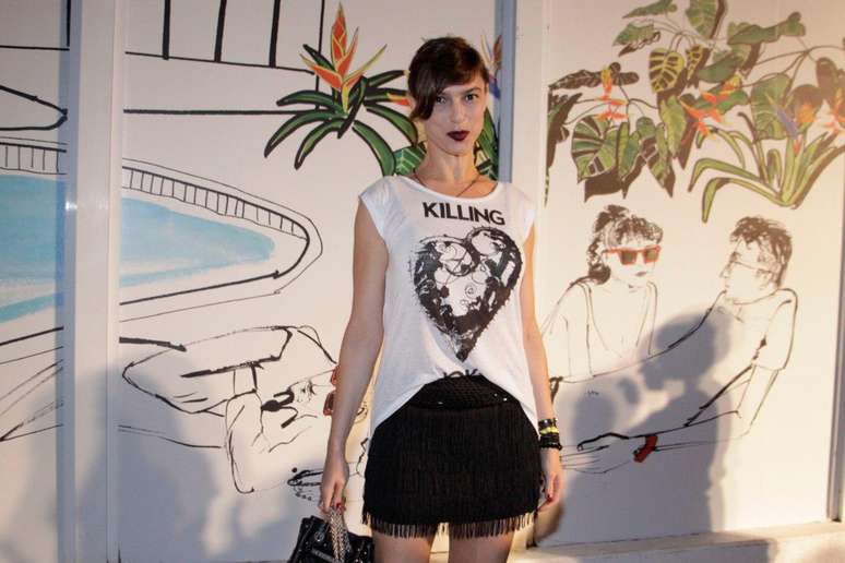 Carol Nakamura, que na quarta-feira havia ido ao Fashion Rio com blusa preta e saia branca, nesta quinta (8) inverteu as cores no look