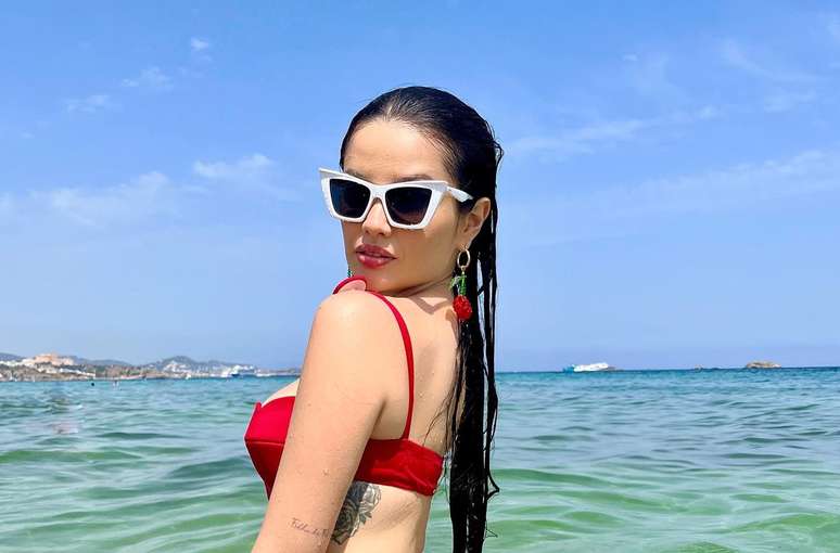 Para curtir uma praia em Ibiza, Juliette apostou em biquíni vermelho com o top em formato de coração e calcinha asa-delta, recurso que alonga as pernas. A camisa branca, na segunda foto, é peça-curinga para colocar na mala, porque pode ser usada tanto como saída de praia, quanto para completar looks básicos. Óculos brancos estão entre as tendências do momento e a corrente dourada usada na cintura acrescenta charme à produção. O biquíni é da marca Hand Lace. O sutiã custa R$ 348 e a calcinha, R$ 178.