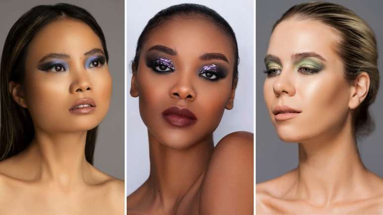 O calor inspira uma paleta mais ousada: tons de coral, bronze, lilás e verde oliva ou metalizado, aparecem como destaques da temporada. Sombra cremosa de longa duração e delineados coloridos são aliados perfeitos para festas ao ar livre e celebrações na praia. O metalizado também retorna com força, especialmente em eventos noturnos.